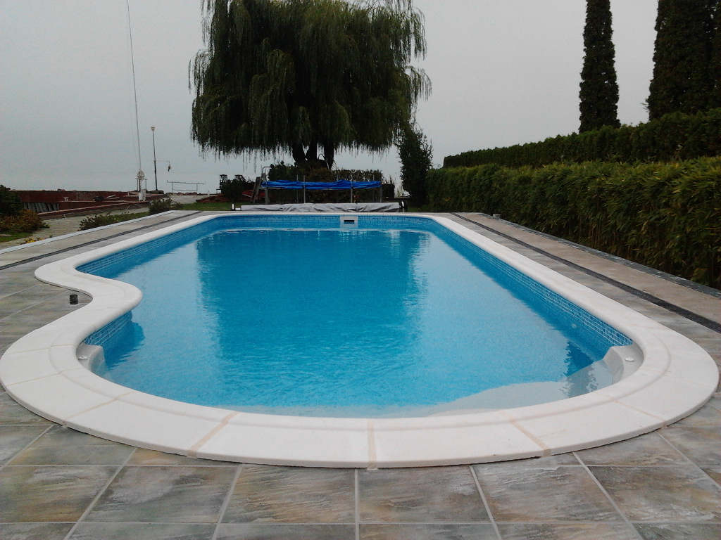 Egyedi tervezésű, 13 m hosszú Cléa úszómedence a vízparton, automatizált vízkezeléssel, szolárzuhannyal. A talajvíz miatt kiemelve a talajszintből.